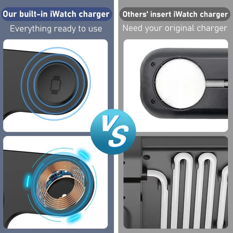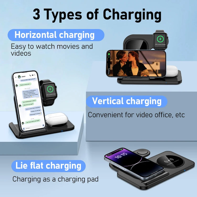 This foldable charging station charges wirelessly for the Apple Watch and for AirPods. For iPhone 16/16 Pro/16 Pro Max/16 Plus/15/15 Pro/15 Pro Max/15 Plus/14/14 Pro/14 Pro Max/14 Plus/13/13 Pro/13 Pro Max/12/12 Pro/12 Pro Max/SE/XR/X/XS/XS Max/11 Pro Max. For Apple Watch Series 10/9/8/7/6/5/4/3/2/SE/SE2/Ultra 2/Ultra. For AirPods Pro 2/Pro/4/3/2 (Wireless Charging Case), more wireless charging phones and earphones.